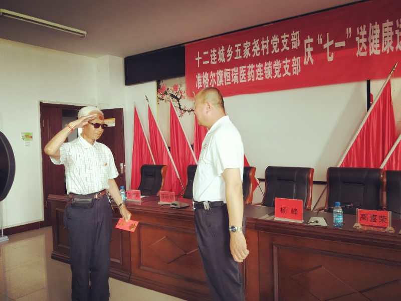 准旗恒瑞医药连锁有限责任公司党支部在准格尔旗市场监督管理局机关党委的领导下,在十二连城乡党委的帮助下和五家尧村建立了长期的党支部互动关系。 在6月29日上午8点公司党支部来到五家尧村慰问党员同志并送上了节日的问候和祝福,为各位党员送上了一份夏日消暑用品,为七十岁以上老党员献上一份温暖的爱心红包以示心意!