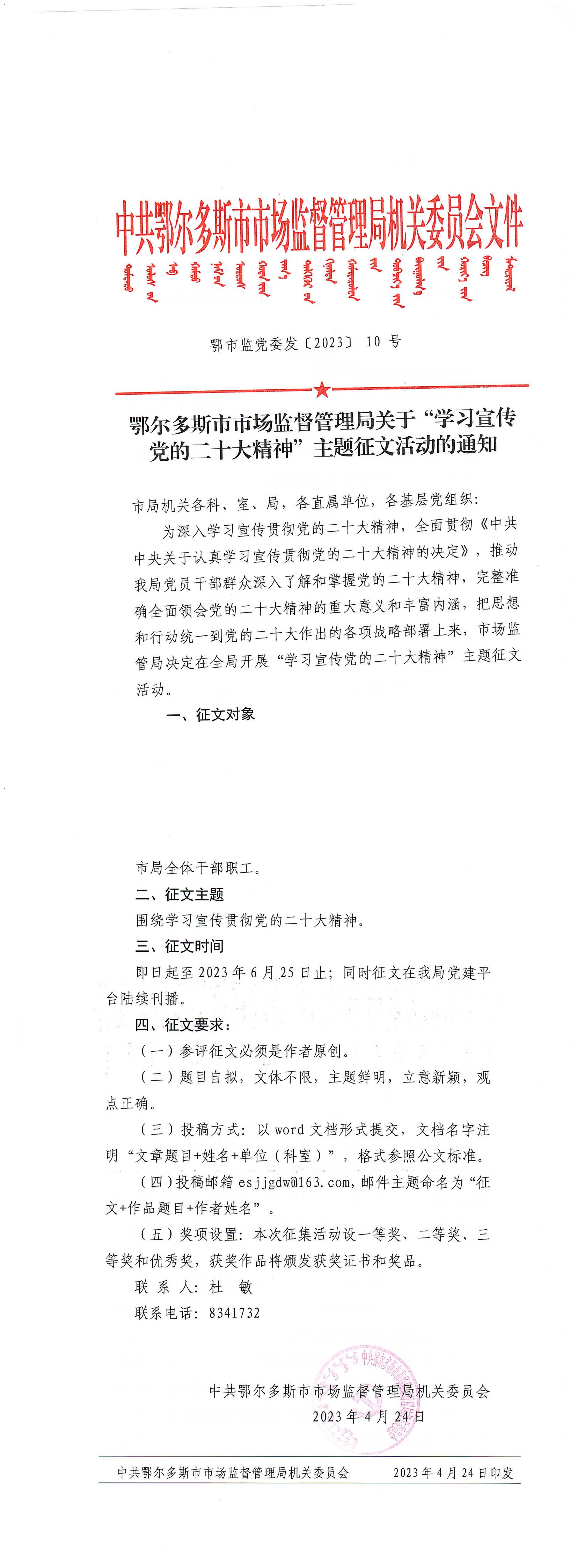 鄂尔多斯市市场监督管理局关于“学习宣传党的二十大精神”主题征文活动的通知