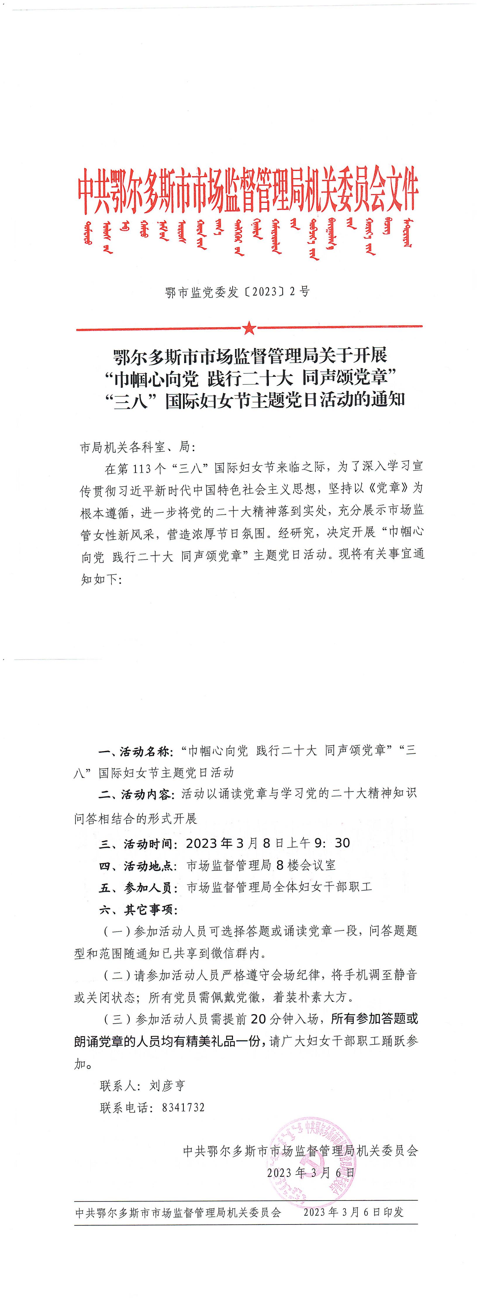 鄂尔多斯市市场监督管理局关于开展“巾帼心向党 践行二十大 同声颂党章”“三八”国际妇女节主题党日活动的通知