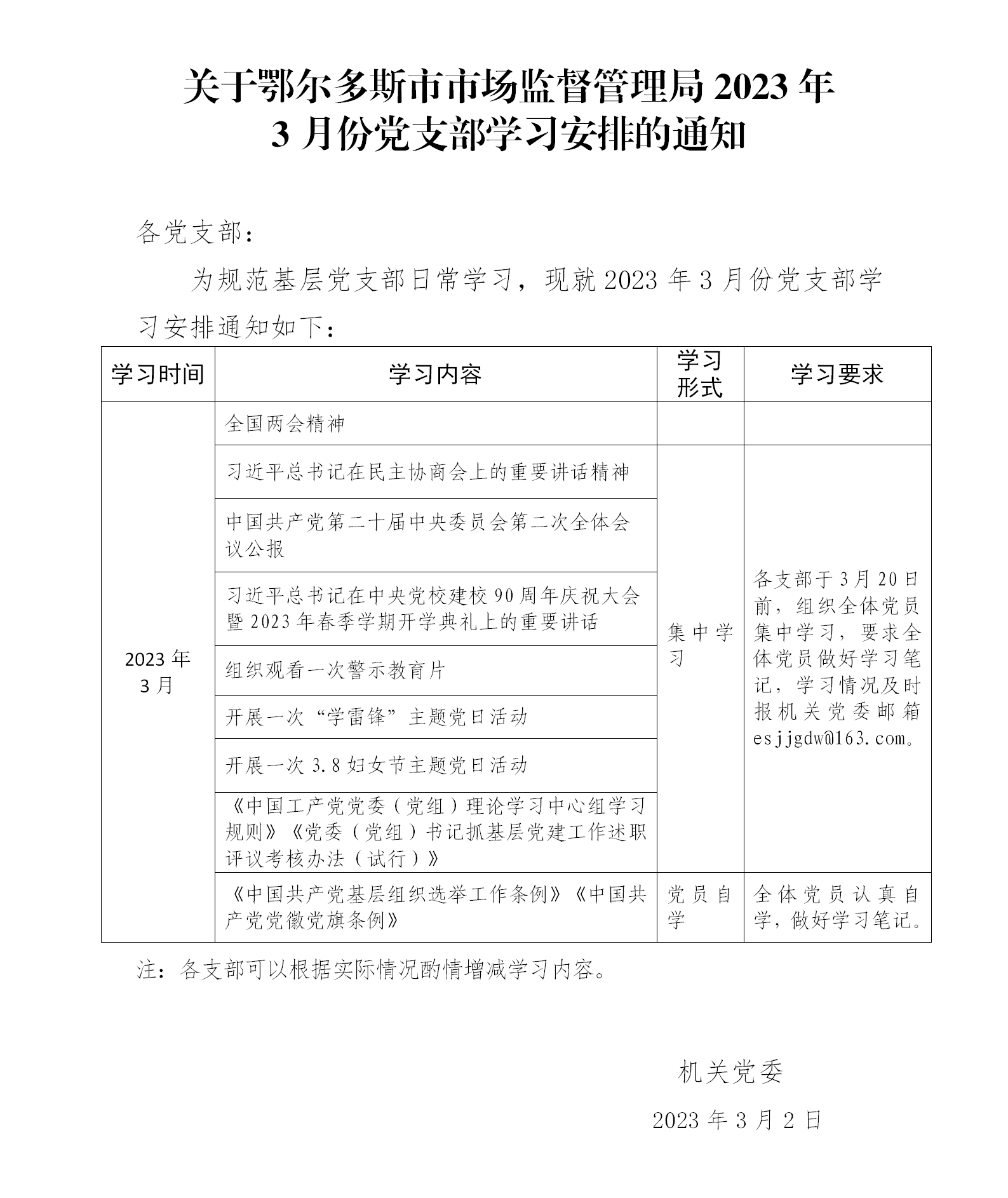 鄂尔多斯市市场监督管理局2023年3月学习党支部学习安排的通知