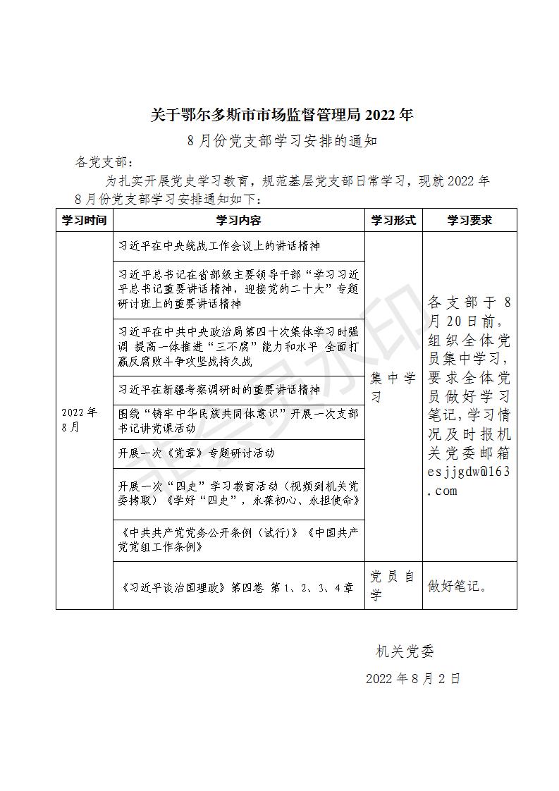 2022年8月份党支部学习安排的通知