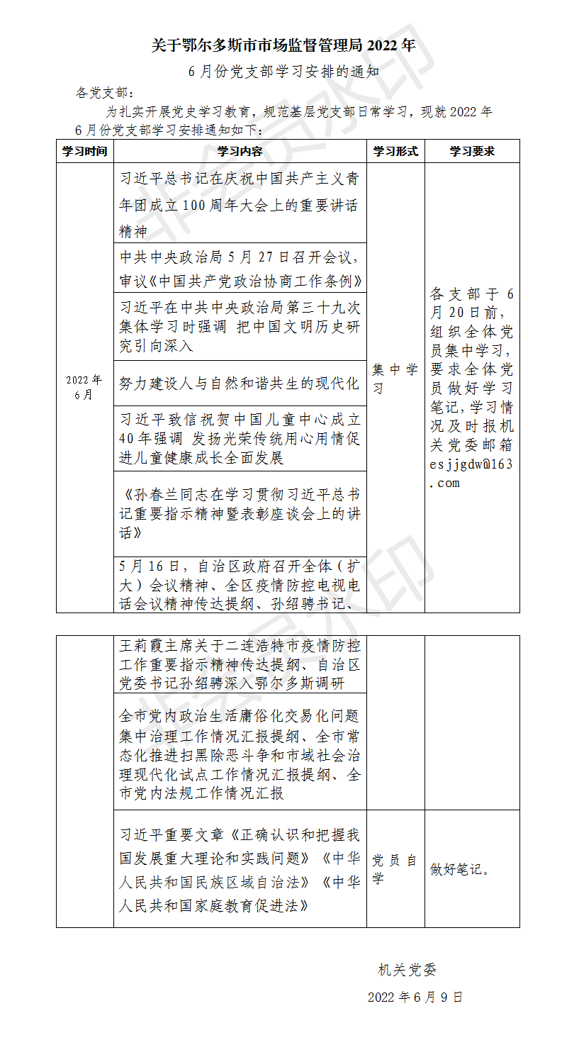 2022年6月党支部学习安排的通知