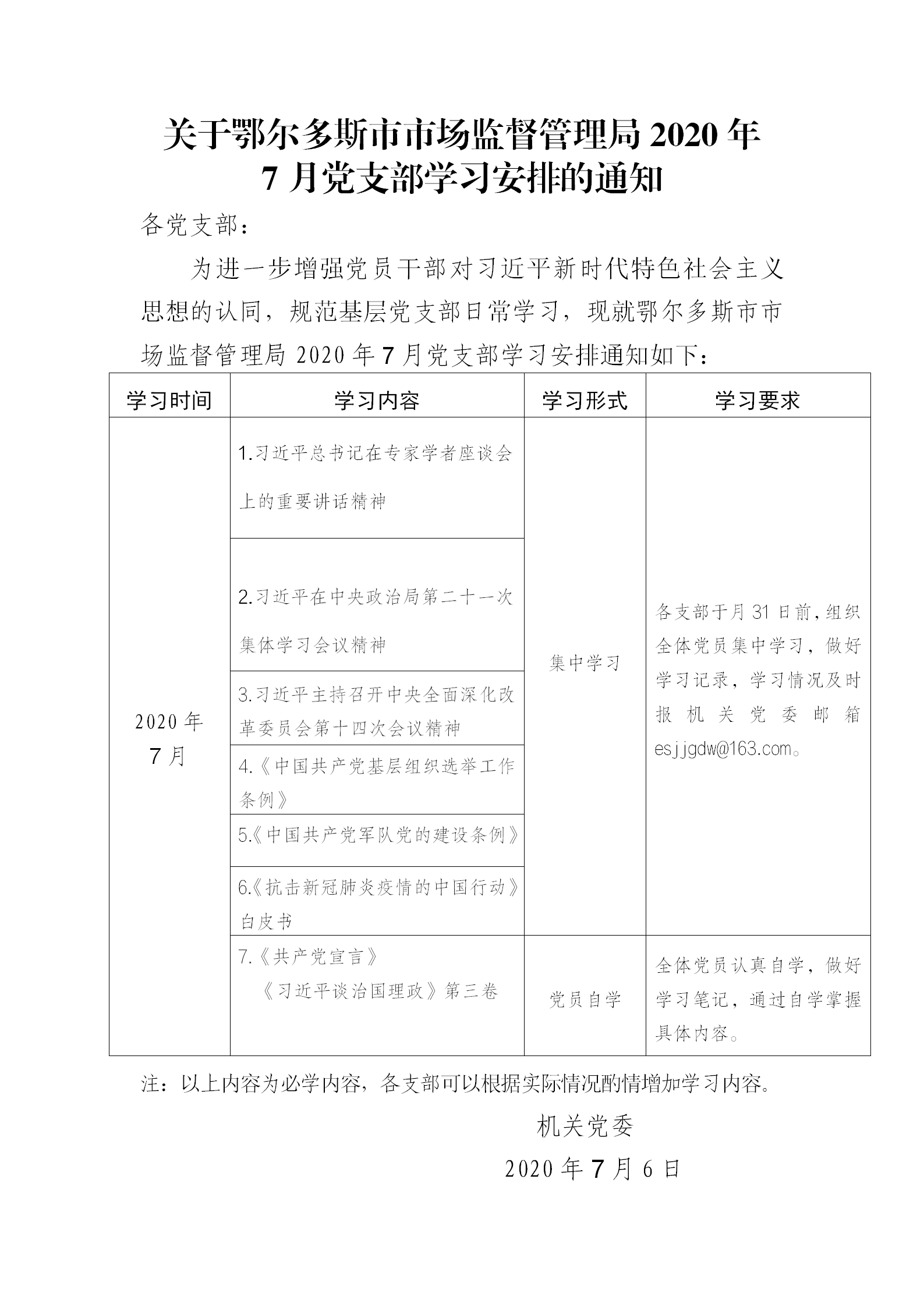 鄂尔多斯市市场监督管理局2020年7月党支部学习安排的通知