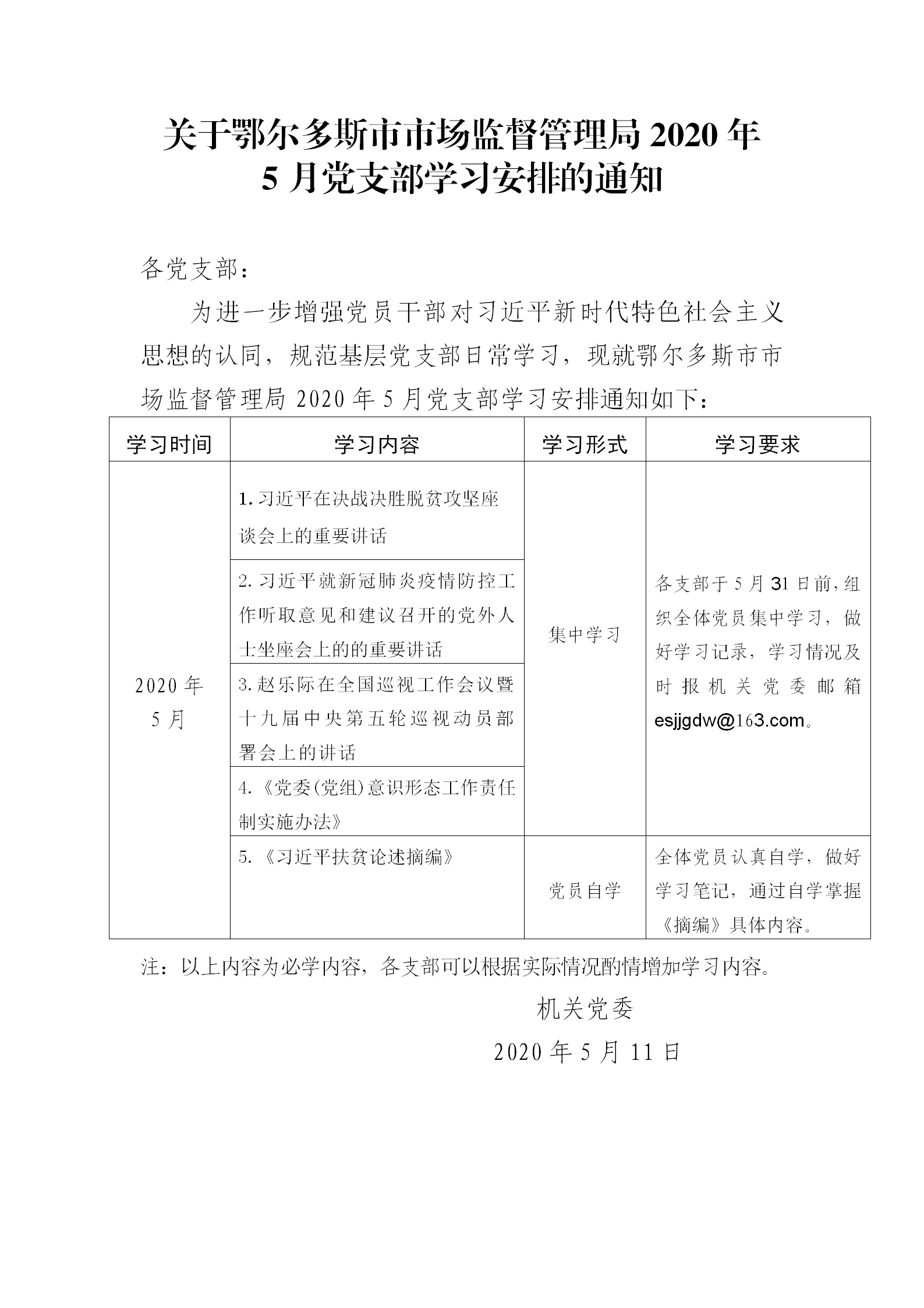 鄂尔多斯市市场监督管理局2020年5月党支部学习安排的通知