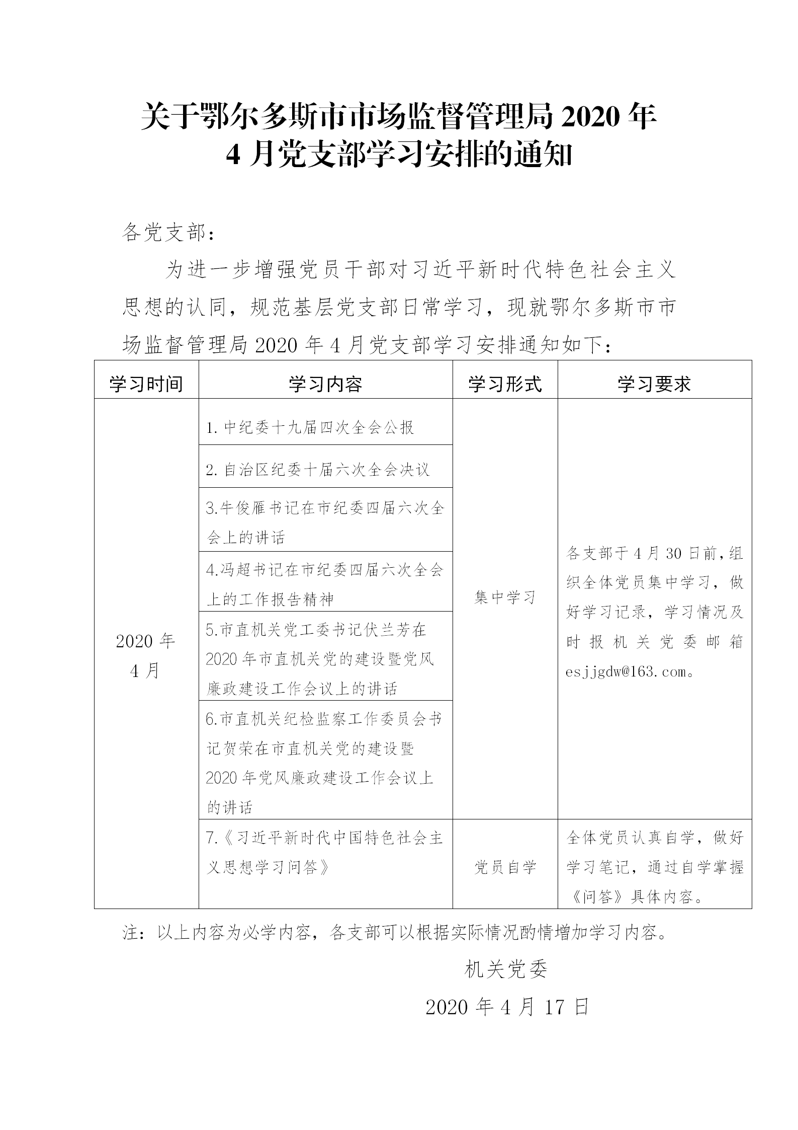鄂尔多斯市市场监督管理局2020年4月党支部学习安排的通知