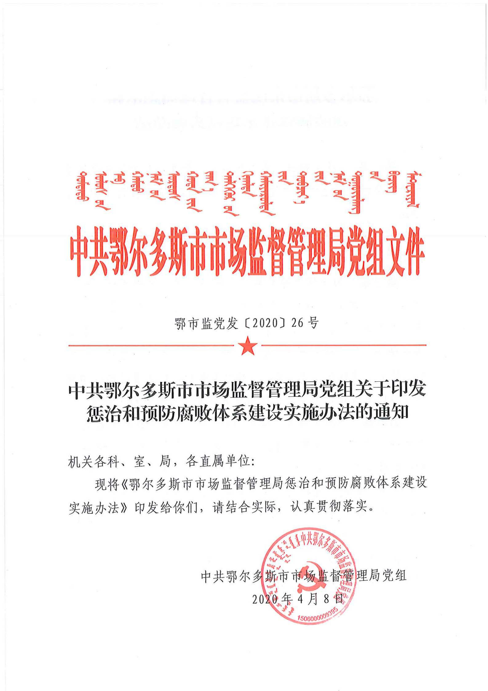 中共鄂尔多斯市市场监督管理局党组关于印发惩治和预防腐败体系建设实施办法的通知