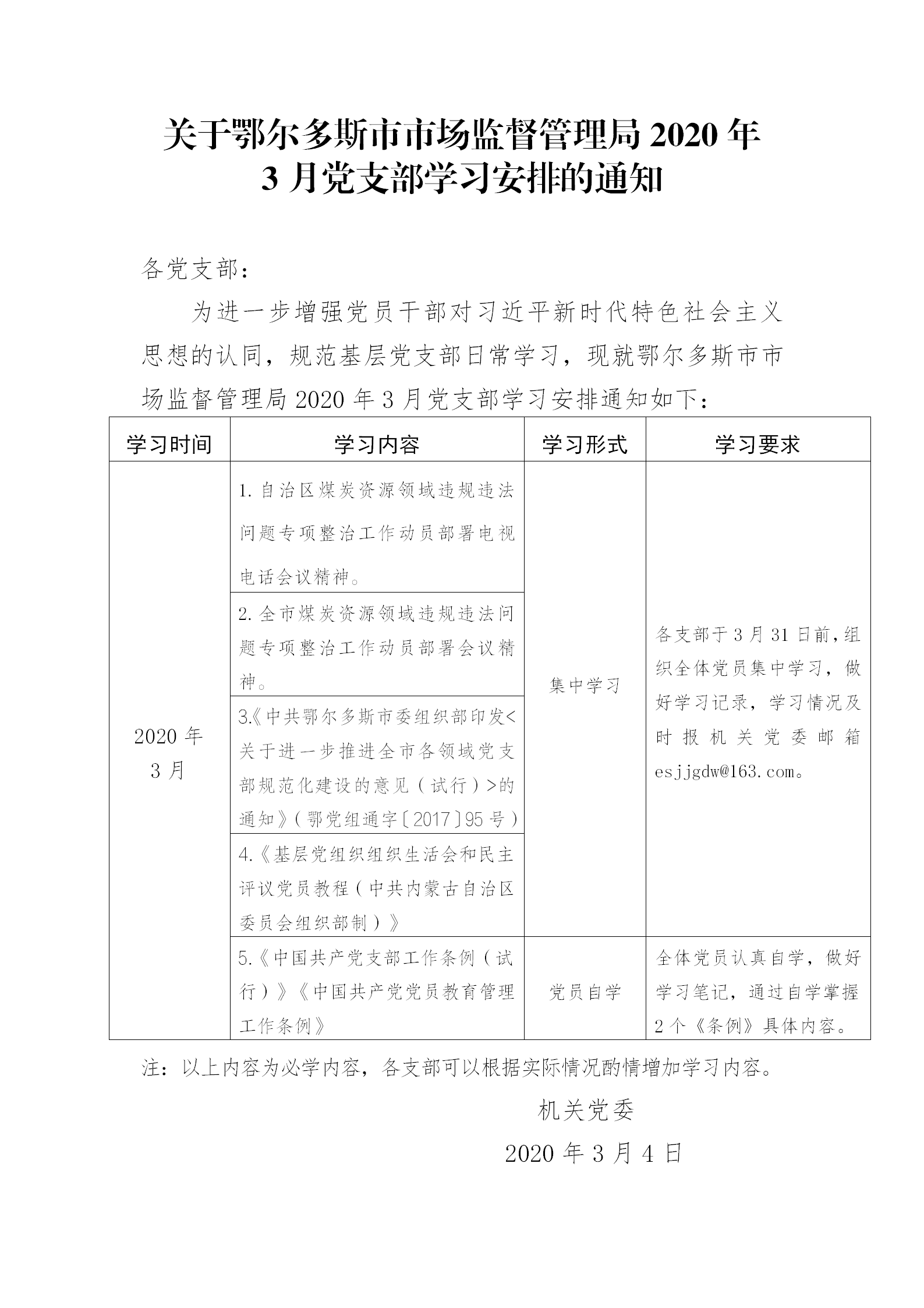 鄂尔多斯市市场监督管理局2020年3月党支部学习安排的通知