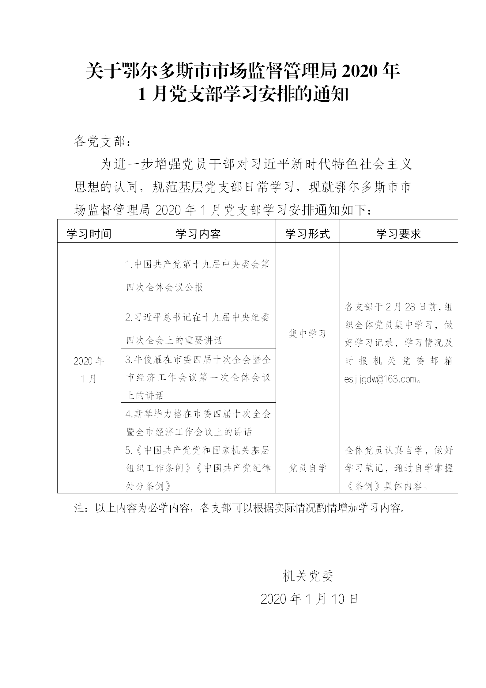 鄂尔多斯市市场监督管理局2020年1月党支部学习安排的通知