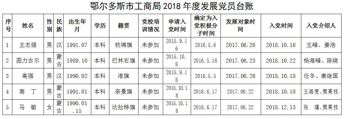 鄂尔多斯市工商局关于2018年度党员发展情况的公示